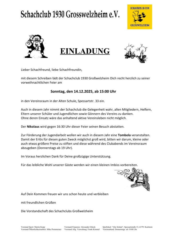 Der Schachclub 1930 Großwelzheim lädt alle Mitglieder, Helfer, Eltern unserer Schüler und Jugendlichen sowie Gönner des Vereins zur vorweihnachtlichen Feier am Sonntag, den 14.12.2025, ab 15:00 Uhr in den Vereinsraum in der Alten Schule, Spessartstraße 33 ein. Neben dem Besuch des Nikolauses gegen 16:30 Uhr wird es zur Förderung der Jugendarbeit wieder eine Tombola sowie Kaffee und Kuchen und einen kleinen Imbiss geben. Für die Tombola können noch gerne Spenden während des Vereinsabends abgegeben werden.
